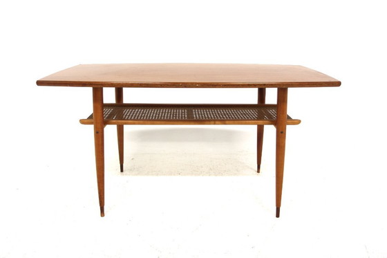 Mahogany coffee table produced in Sweden in the 1960s. Simple, clean, and mid-sized, this table will fit perfectly into a small living room. Rattan magazine rack with brass base.