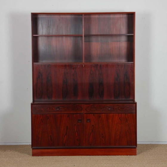 This Scandinavian writing desk is made of Rio rosewood. It was designed by Erik Brouer for the manufacturer Brouer Mobelfabrik. It was made in Denmark in the 1960s.
