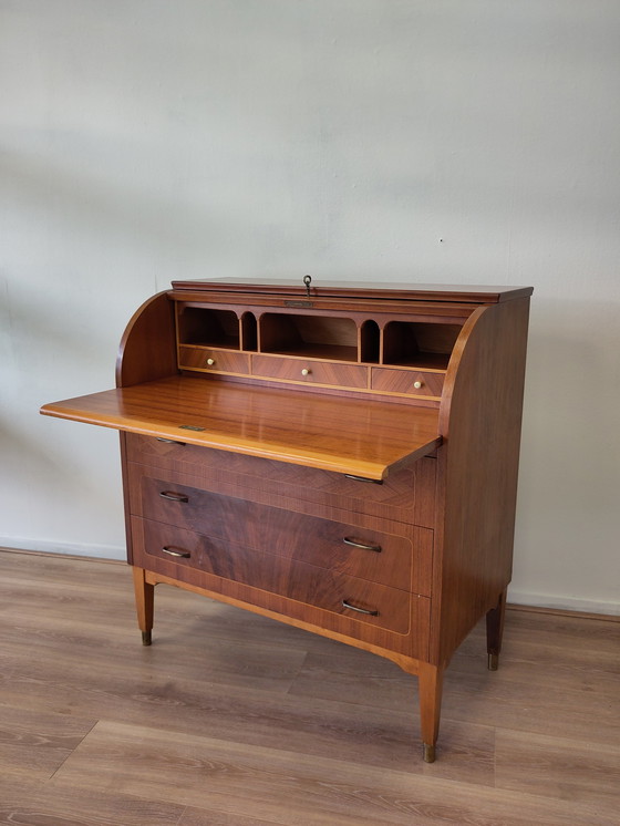 This 1950s/60s cabinet features a roll-top design that slides up smoothly. Behind it, you'll find three drawers and compartments with storage options. Under the flap is a pull-out worktop with a working lock; the top drawer can also be locked with the key. Under the desk top are three large, wide drawers spanning the full width for storing all sorts of things. The cabinet stands on four solid wood legs with a brass finish on the underside.