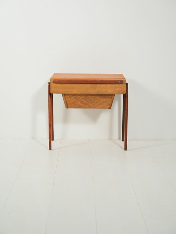 Elegant 1950s Scandinavian sewing table in teak and oak, defined by soft organic lines and rounded profiles. The hinged top opens to reveal an ingenious sewing drawer with internal dividers and thread holders, showcasing the balance between craftsmanship and practicality typical of mid-century Nordic design. The contrast between the warm teak legs and the light oak structure creates a refined visual balance.