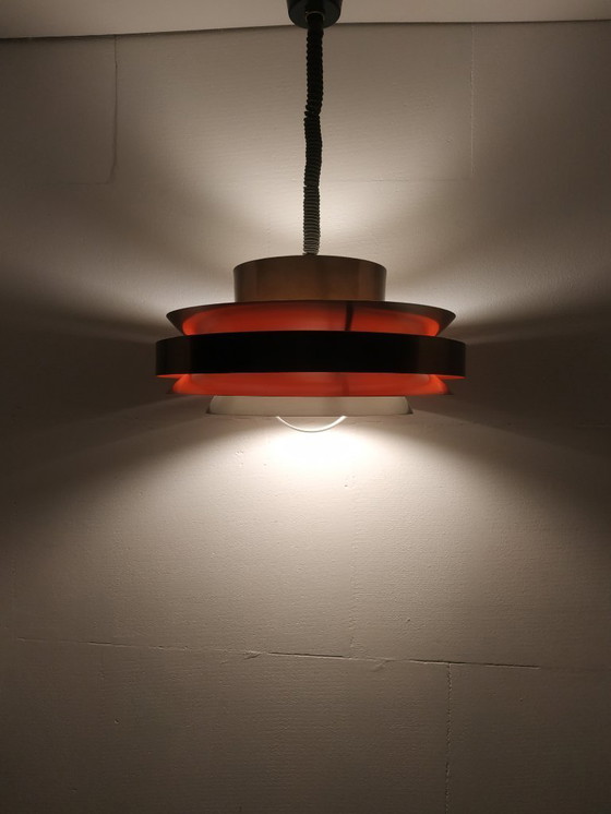 Stunning designer lamp by Herda, a silver-bronze ceiling lamp with white/cream enameled interiors (presumably enameled) seen from below. It's adjustable using the famous Italian "Rolly" retractable cable system by pulling the handle on the bottom of the lamp and pushing it upward. The rings are likely made of stainless steel, possibly aluminum, but we're not sure. Made in the 1960s and 1970s, it features a beautiful design in the style of Philips, Poulssen, Carl Thore, Jo Hammerborg, Fog, and Morup. The lamp is also listed internationally as Lakro, but if you look at our "sold" items, you'll see a virtually identical lamp with the original Herda label. Therefore, we refer to this lamp as the manufacturer/designer Herda Amsterdam. The lamp has been completely disassembled for cleaning and inspection. If you wish, we can provide you with information on how to disassemble the lamp should you need to replace anything. The lamp will be shipped insured and will receive optimal packaging (a slight additional charge applies). We assume no risks for you as a customer or us as the seller.