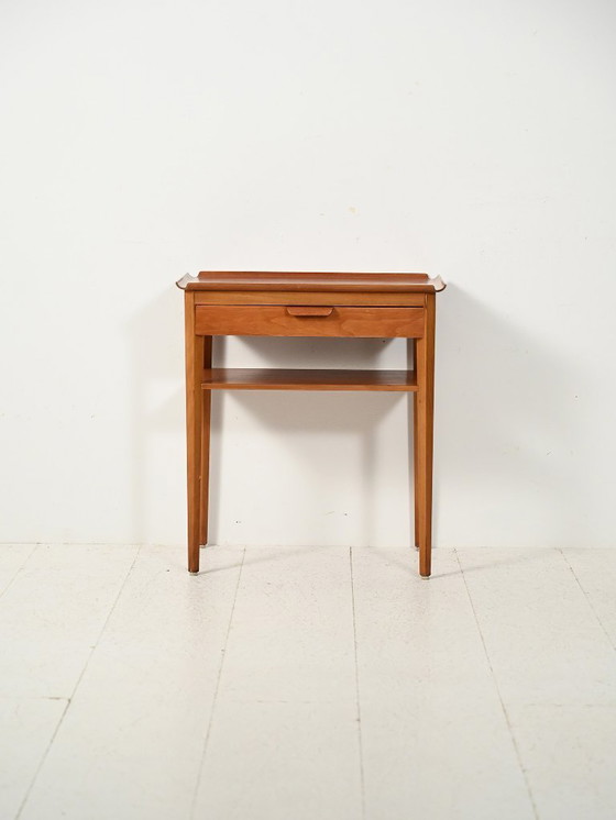 Scandinavian teak bedside table designed by Bertil Fridhagen for Bodafors, a refined example of Swedish production from the 1950s–60s. The composition is slender and essential, raised on four tapered legs with a lower shelf that visually lightens the structure. A defining feature is the curved shaping of the top, with its raised edge and softly rounded corners forming a continuous, almost organic frame. In subtle counterpoint, the drawer handle curves in the opposite direction. Fridhagen, active for Bodafors, is known for a restrained yet sophisticated design language, balancing functionality with discreet sculptural detailing. His work belongs firmly within the Swedish modern tradition, where proportion, craftsmanship and material sensitivity shape furniture conceived to endure over time.