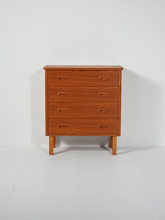 Clean lines and balanced proportions define this 1960s teak chest of drawers. Four drawers feature double recessed, oval pulls with raised edges. Squared legs give a light stance, while the rounded top softens the silhouette—an elegant nod to mid-century Nordic design.