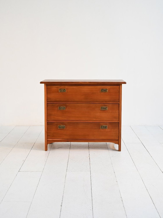Teak chest of drawers from the 1960s with a three-drawer front, characterized by compact proportions and solid construction typical of the restrained and functional Northern European design of the period. The drawers feature dovetail joints, indicating careful craftsmanship and quality construction. The inset brass handles, stamped A-B Br. Miller, introduce a discreet detail consistent with the design language of the time.