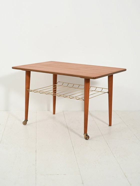 Scandinavian 1960s teak coffee table on casters, with a brass slatted magazine rack; clean lines and understated elegance, warm mid-century feel.
