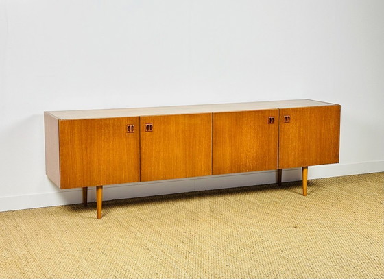 Vintage Scandinavian teak sideboard dating from the 1960s, featuring four doors with minimalist shelves.