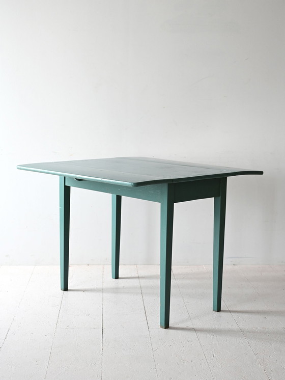 1950s Scandinavian vintage table, crafted in wood with a sturdy structure and tapered legs. The rectangular top features two drop-leaf extensions, allowing for easy size adjustment. The distinctive green finish adds character while preserving the charm of mid-century Nordic design. Good condition. May show signs of age. Please refer to the photos.