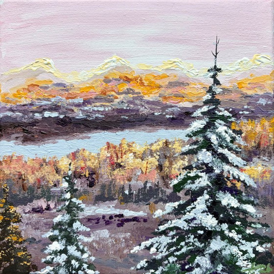 Fjällen is inspired by the vast landscapes of Lapland. The foreground with snow-covered pines contrasts with a warm, almost luminous sky and a layered horizon of mountains and forest. This tension between cold and warmth gives the work depth and character.