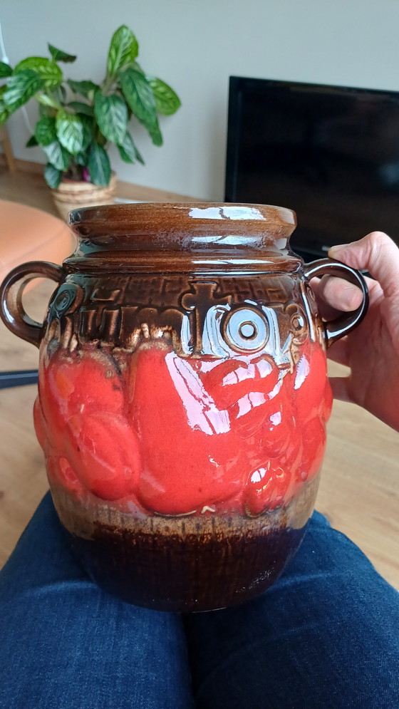 Discover the charm of this authentic Scheurich ceramic Rümtopf, a beautiful example of vintage German ceramics. With its rich brown and vibrant red hues, this pot adds a touch of retro elegance to any space.