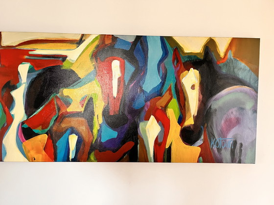 Add a vibrant touch to your space with this abstract painting by Helma Kotoun. The dynamic composition features bold strokes and a rich palette of reds, blues, yellows, and greens, creating a captivating visual experience. Perfect for modern interiors, this piece will enliven any room with its energetic presence.