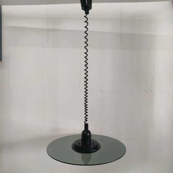 Schitterende verstelbare plafondlamp met licht rookglas glasplaat. Het glas in zeer goede staat. De Open structuur van het lichtpunt geeft een schitterend effect op de omgeving. De lamp is voorzien van een rolly hangsysteem waardoor de lamp in hoogte verstelbaar is.
