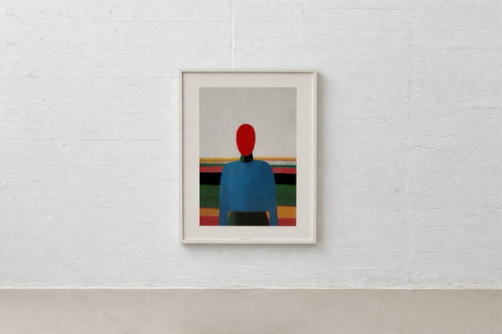 A vibrant art print based on the work "Torso" by the Russian avant-garde artist Kazimir Malevich, originally created between 1928 and 1932. The composition depicts a simplified, almost iconic figure with a red head and blue body against a rhythmically structured, geometric landscape rendered in bold color fields. Typical of Malevich's later work, this motif combines figurative elements with the clear, abstract formal language of Suprematism. The strong color contrasts and the tranquil, almost meditative effect make this work a striking focal point at the intersection of art and design.