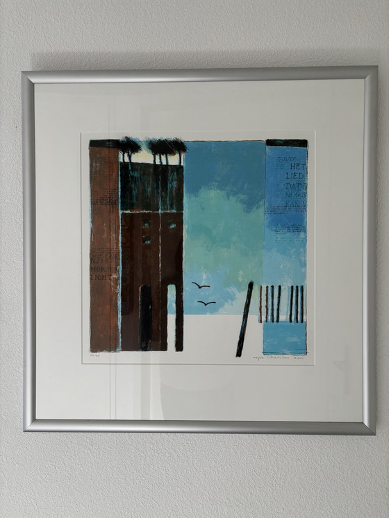 A screenprint by Magda Luttikhuizen titled "Bij morgenlicht" (By Morning Light) from 2001. Signed in pencil, edition 66/90. The screenprint is framed in a silver frame. Dimensions: 70x70 cm. I am also offering a screenprint by Magda Luttikhuizen titled "Ik Luister naar hetb lied" (I Listen to the Song).