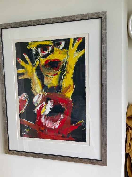 This beautiful screen print, titled "Dancing Child" by Charlotte Molenkamp, is an expressive artwork that captures the vibrancy and joy of a dancing child. The bold colors and dynamic brushstrokes convey a sense of movement and energy, making it a striking piece for any art collection.