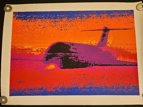 Experience the vibrant expression of aviation in this screen print by Henk van der Vet. Printed on heavyweight paper, this artwork captures the dynamism and power of an airplane in flight against a colorful background.