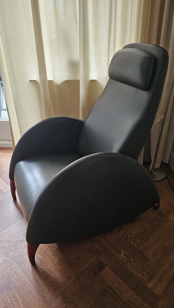 Experience ultimate comfort with the Scudo recliner from Young International. This elegant chair combines modern design with high-quality materials, making it a perfect addition to any stylish living room. The chair is upholstered in luxurious dark green leather and has sturdy wooden legs in a warm brown hue. This dark green leather Scudo recliner was designed by Frans Schrofer for Young International – now part of the Gelderland company. * Removable/adjustable headrest attached with a magnet. * Very comfortable recliner