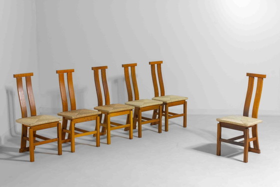 Elegant set of six dining chairs from the 1980s with sculptural solid wood frames and handwoven rush seats. The tall, curved backrests give each chair a strong vertical presence while offering ergonomic support. The natural materials and bold lines strike a balance between rustic and modern.Did you know, rush weaving is a traditional technique used for centuries across Europe. Its natural elasticity and durability made it a popular choice during the back-to-nature design revival of the 1980s.