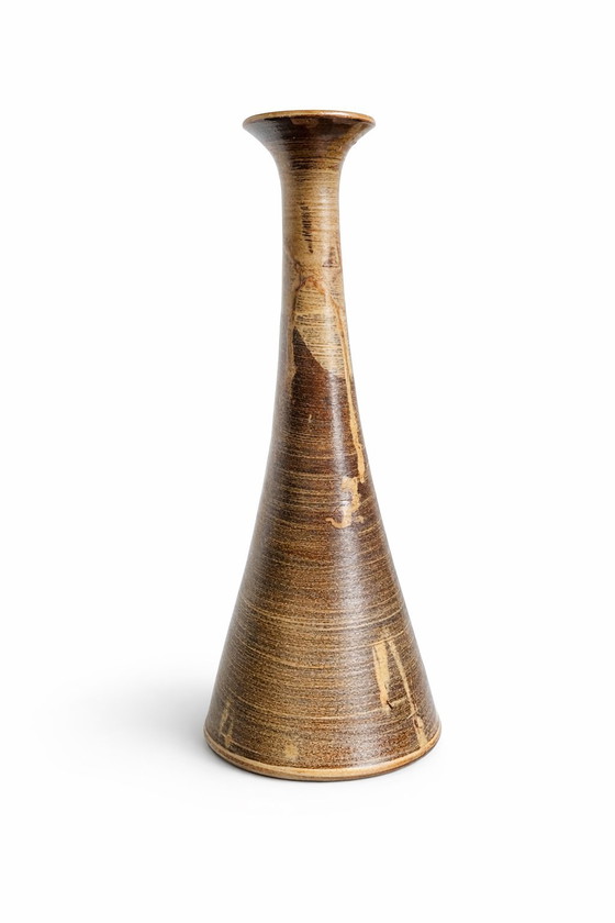 This exquisite sculptural ceramic vase embodies the elegance of Mid-Century Modern design, dating from the 1960s to 1970s. Its sleek, elongated form and earthy tones make it a striking addition to any sophisticated interior.