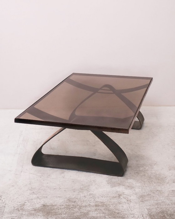 The glass top shows some minor signs of wear, subtle but present, as is typical for a 50-year-old smoked glass table.