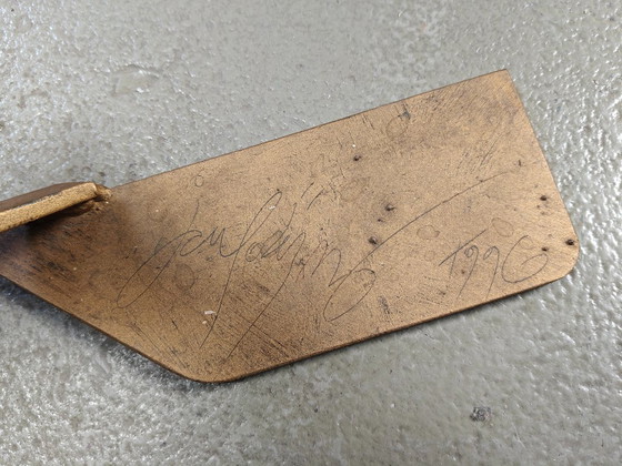 The coffee table, even more eye catching is made out of a car side window table top, mounted on 3 upside down mounted wine glasses which one their onw are placed onto a golden metal base, which is a collection of different parts, welded togheter to create an intresting looking sculptural whole.