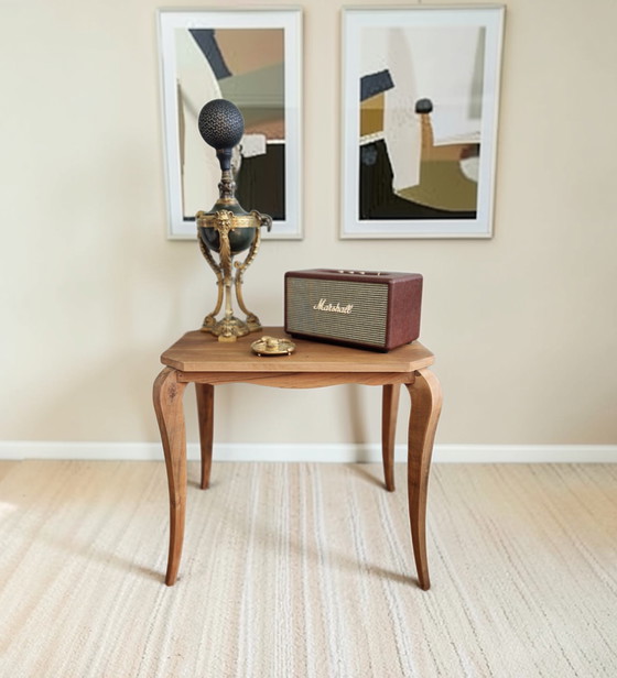 An elegant side table crafted from solid walnut, with a fluid and timeless design inspired by the lines of a modern take on the Louis XV style.