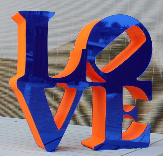 The 3D sculpture "LOVE" is plated with blue chrome on both the front and back, as seen in the images, on the back of the sculpture is the artist's signature and a certificate of authenticity, and can be displayed in any room (office, living room, etc.).