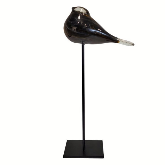 A delicate blown glass sculpture of a dove or turtledove, of French origin and created in the 2010s. Crafted from blown glass, this minimalist dove is an excellent example of French artisan talent. The piece is a small block that subtly outlines the silhouette of a dove; we can distinguish the beak, the body with the wings attached to it, and the long tail. This body rests on two slender iron legs that are attached to a simple rectangular base.