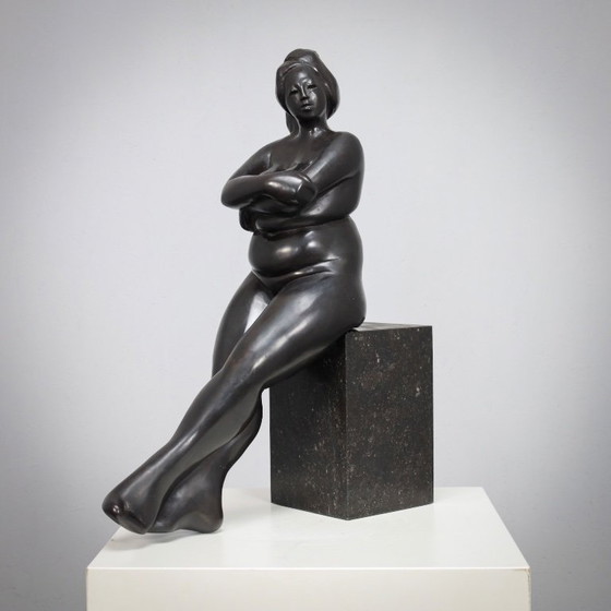 A refined bronze sculpture by Dutch artist Francine Govers, created in the 1990s. The work depicts a seated female figure, rendered with a soft yet confident presence.