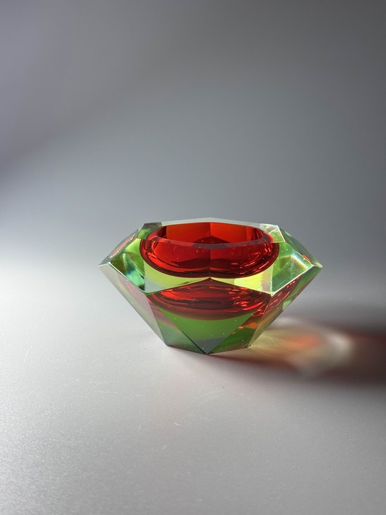 The bold geometric form, reminiscent of a cut gemstone, is characteristic of Poli’s work and reflects the modernist aesthetic developed at Seguso Vetri d’Arte in the 1950s. The precise faceting enhances light refraction, creating vivid transitions between red and green tones.