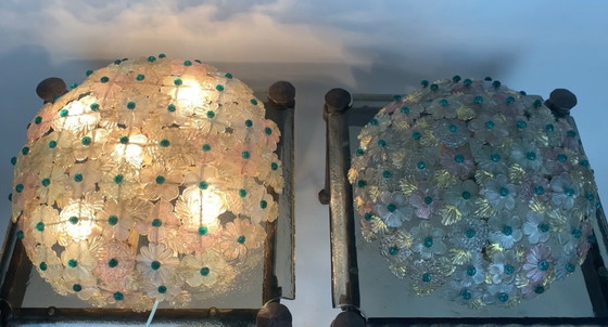 This exquisite pair of flush mount ceiling lights by Seguso vetri d’arte showcases a stunning floral design crafted from high-quality glass. The intricate detailing and vibrant colors make these pieces a standout addition to any room. Perfect for adding a touch of elegance and sophistication, these lights are both functional and decorative, embodying the timeless beauty of Art Deco style.
