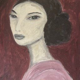 It's a modern portrait of a woman, hand-painted on wood. The artwork depicts a woman with a serene expression, rendered in a palette of black, white, pink, and red. The background is a deep red, which creates a beautiful contrast with the soft tones of the woman's face and clothing. The painting exudes a sense of elegance and simplicity, perfect for a contemporary interior.