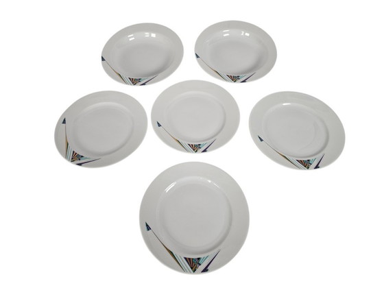 Discover the unique charm of this set of six plates from Seltmann Weiden, crafted in Bavaria, Germany. Embodying the postmodern Memphis style of the 1980s, these plates are a perfect addition to any design-conscious table setting. The bold geometric patterns and vibrant colors add a playful and artistic flair to your dining experience. - Made of high-quality porcelain, known for its durability and elegance. - The Memphis style, characterized by its striking and colorful designs, makes these plates a real eye-catcher. - Perfect for both everyday use and special occasions, these plates combine functionality with aesthetics. Add a touch of retro style to your interior with these beautiful plates and make your table shine.