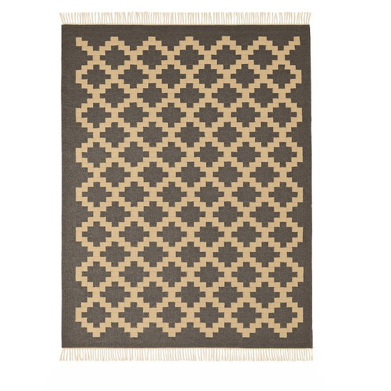 Design-driven, handmade in Egypt, and fair-trade: this Senon (Egyptian diamond) kilim pairs a grey geometric pattern with a light base for bold contrast—great in monochrome interiors. Size: 160 × 230 cm flat-weave kilim; fringed ends Condition: New Placement: Hallway, living room, bedroom side Care: Vacuum regularly; spot clean only