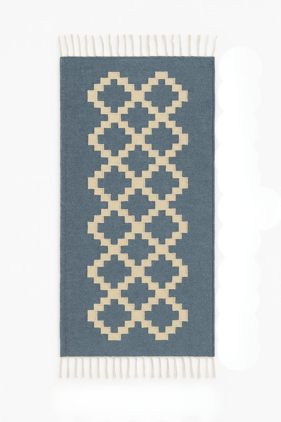 Design-driven, handmade in Egypt, and fair-trade: this Senon (Egyptian diamond) kilim pairs a grey geometric pattern with a light base for bold contrast—great in monochrome interiors.
