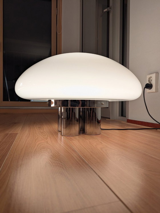 The large, mushroom-shaped opal glass shade rests on a chrome-plated metal base with four cylindrical legs, creating a stable and futuristic base. The diffused light through the white opal glass shade creates a soft, atmospheric glow, ideal for a sideboard, side table, or as a statement piece in a modern interior.