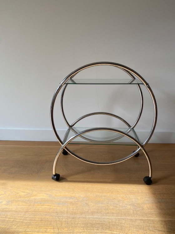 This vintage serving cart from the 1960s-1970s is a stylish addition to any space. Its circular metal frame and glass shelves offer a sleek, retro look. Perfect for entertaining, it combines functionality with a touch of nostalgia.