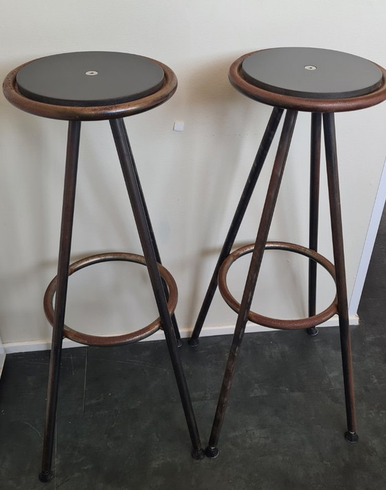 ConditionVery goodColorsBrown, BlackMaterialWood, MetalNumber of items2Height80 cmWidth33 cmDepth33 cmSeat height80 cmSigns of usageRust