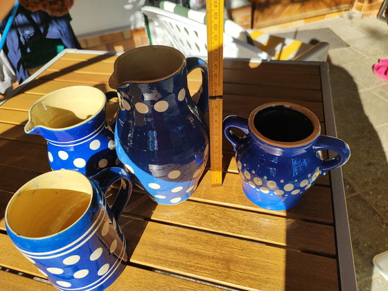 This rustic German country house style set from the GDR era stands out with its eye-catching design featuring large white dots on a deep blue and light blue background. It consists of several ceramic pieces that are ideal for everyday use or as decorative elements. The DDR quality gives each piece a unique character.