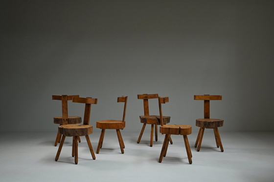 Set brutalist tree trunk chairs, 1970s France. This striking set of six Brutalist dining chairs is handcrafted from solid wood, each featuring a distinctive seat made from a cut tree trunk. The raw and sculptural design highlights the natural grain, cracks, and irregularities of the wood, giving every chair its own unique character. The bold geometric backrests and sturdy legs complement the organic texture of the seats, creating a strong architectural presence. These chairs embody the essence of Brutalist design: honest materials, raw craftsmanship, and uncompromising form. The chairs show signs of use consistent with their age, which enhances their authentic character without compromising their stability or function.