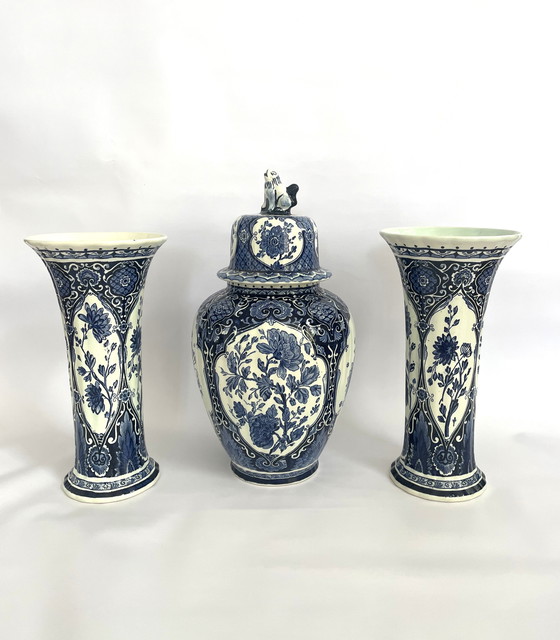 Set of Delft Blue ceramics, 1x lidded vase/ginger pot/urn vase and 2x trumpet vases. Made by Boch (Boch Frères Kéramis) for Dutch Royal Sphinx Maastricht (Petrus Regout).