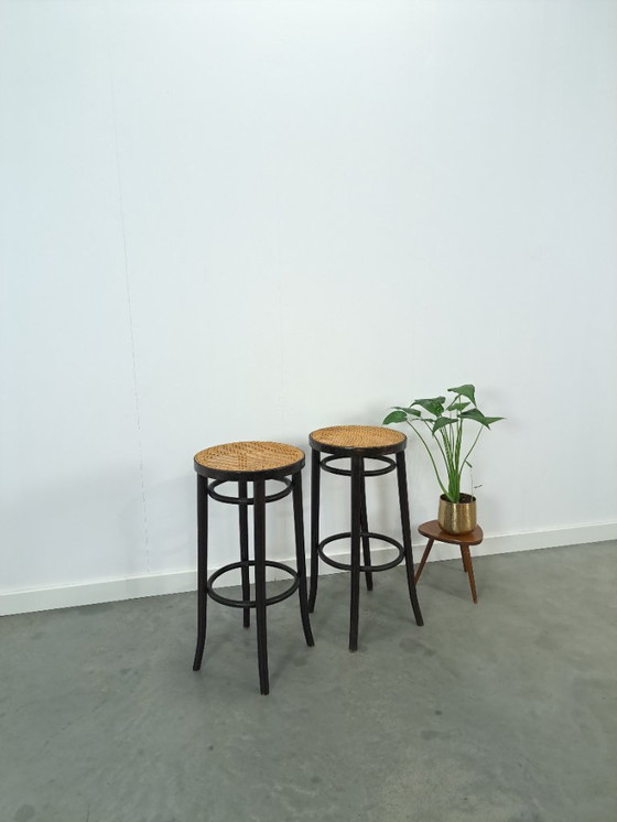 The bar stools are in good and solid condition, with signs of use befitting their vintage age. One stool has a weak spot in the webbing on the side.