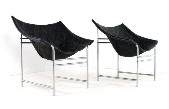 This set of two original Montis Swing armchairs, designed by Gerard van den Berg, makes a powerful and elegant statement in any interior. The armchairs are crafted from deep black leather, combined with a sleek metal frame that refines and balances the robust look.