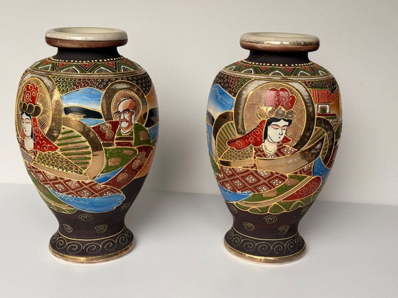 Immerse yourself in the exquisite artistry of these Japanese Satsuma vases, a set that embodies the elegance and cultural richness of traditional Japanese craftsmanship. Each vase is adorned with intricate hand-painted designs that depict serene landscapes and figures, capturing the essence of Japanese aesthetics. The vibrant colors and detailed patterns make these vases a captivating addition to any collection or interior space, offering a glimpse into the timeless beauty of Satsuma ware.
