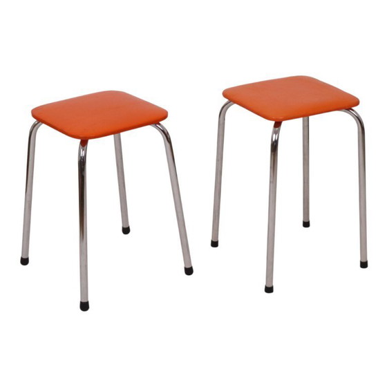 Nice set of two vintage stools with orange faux leather seats and a chrome base; one stool is marked Gama, the other is presumably by Brabantia, vintage objects from the 60s-70s.