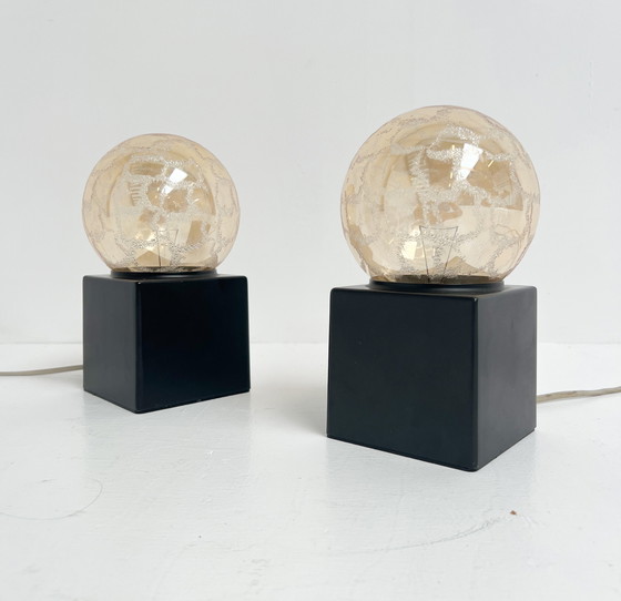 Beautiful set of black cube lamps by Philips from the 1960's. The lamps have new gold colored bulbs. The lamps are 10 x 10 x 10 cm. the height including the bulbs is 22 cm. With porcelain E27 fittings. In working condition with zeet light signs of use.