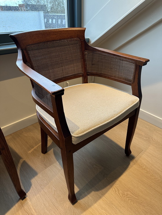 Beautiful set of two original Bannink armchairs, crafted from solid wood with elegant details and characteristic woven panels on the back and armrests. These chairs have recently been professionally reupholstered by the previous owner with a light, elegant fabric, making them both comfortable and stylish.