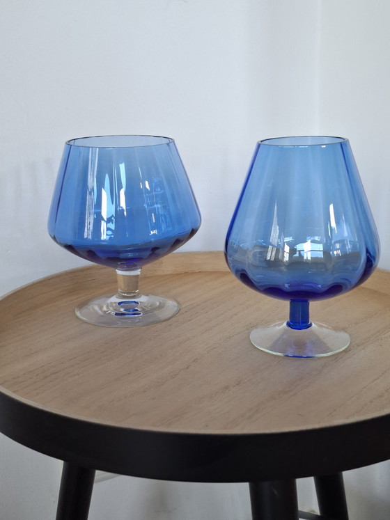 A stunning set of two vintage cobalt blue glass vases in the iconic "brandy snifter" shape. These vases are a beautiful example of Mid-Century Modern design and are strongly reminiscent of the famous Italian Empoli glassware.
