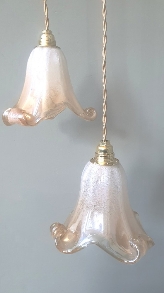 Set of 2 Vintage Murano pendant lamps with a soft, undulating bell shape reminiscent of flower calyxes. The mouth-blown Murano glass features subtle bubbles and a warm amber glow. Handmade glassware from Italy. Beautiful mid-century design.