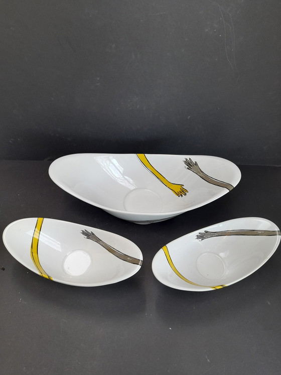 Set of 3 vintage 1980s plates. White ceramic decorated with long yellow and gray arms and hands. Designed by Corry Ammerlaan for Artihove. Signed on the base.