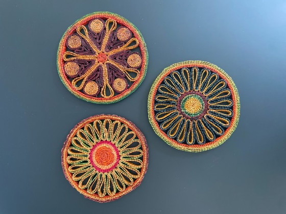Set of three retro coasters made of woven reed with colorful, graphic patterns and a recognizable look that evokes nostalgia in many.